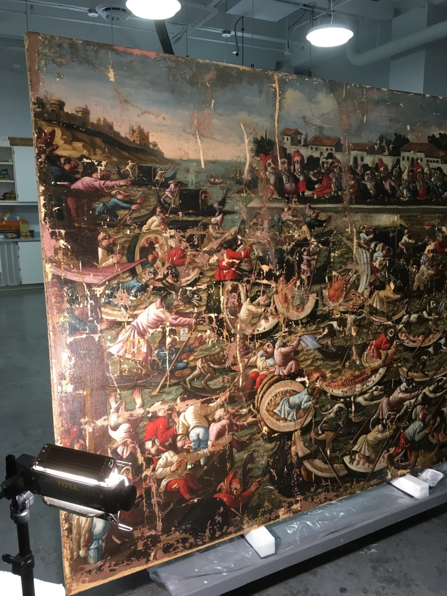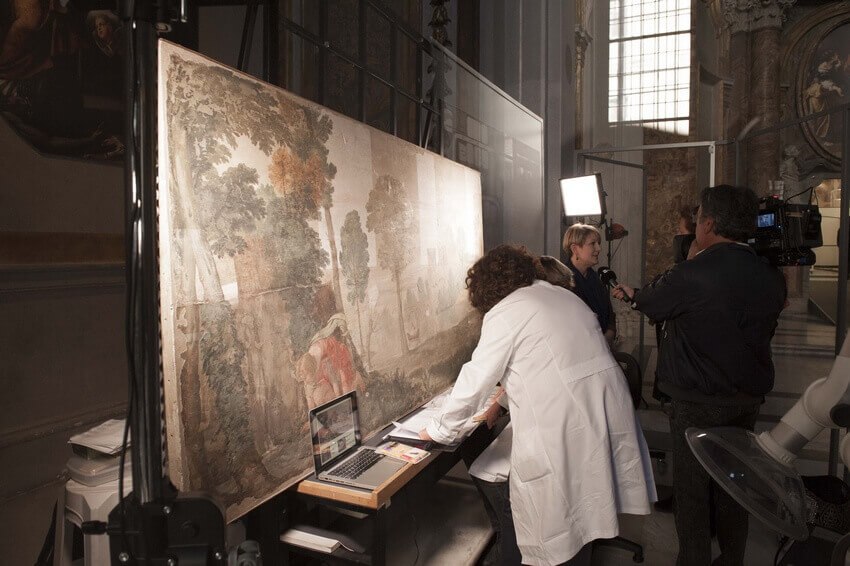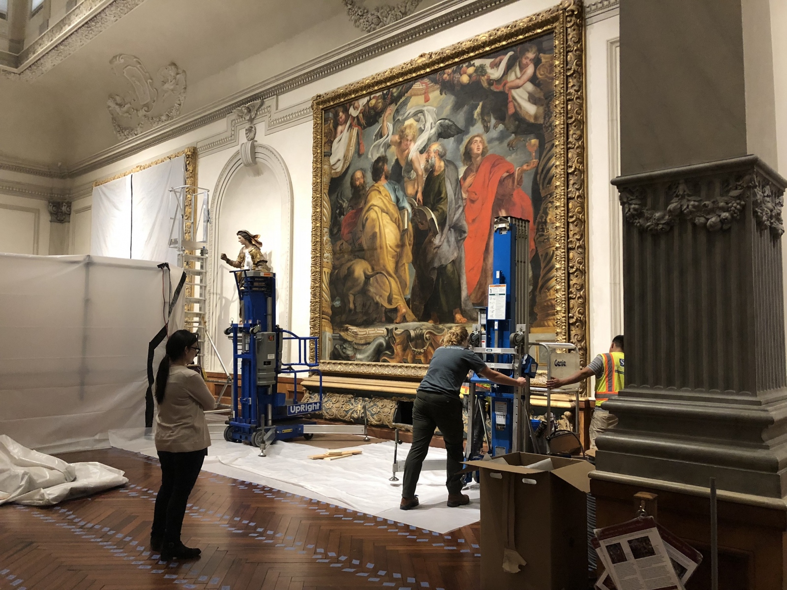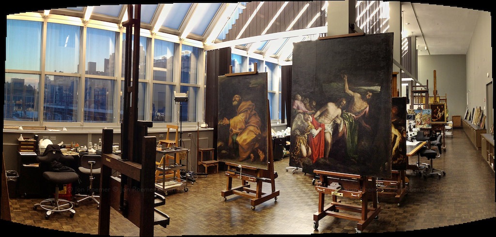 There’s a lot I learned by way of observation, seeing conservation experts at work on various easel and work area setups. And how variable scale, quality and actual texture of the various works as seen from up close or distant perspective, via high quality photography. I myself worked in film and video related jobs as a contracted artist so I am familiar with doing large scale works over 100 ft tall and 600 ft wide. In the movies they are referred to as backdrops, and you need to use scissor lifts and condors (like a small 4 wheel mini crane).